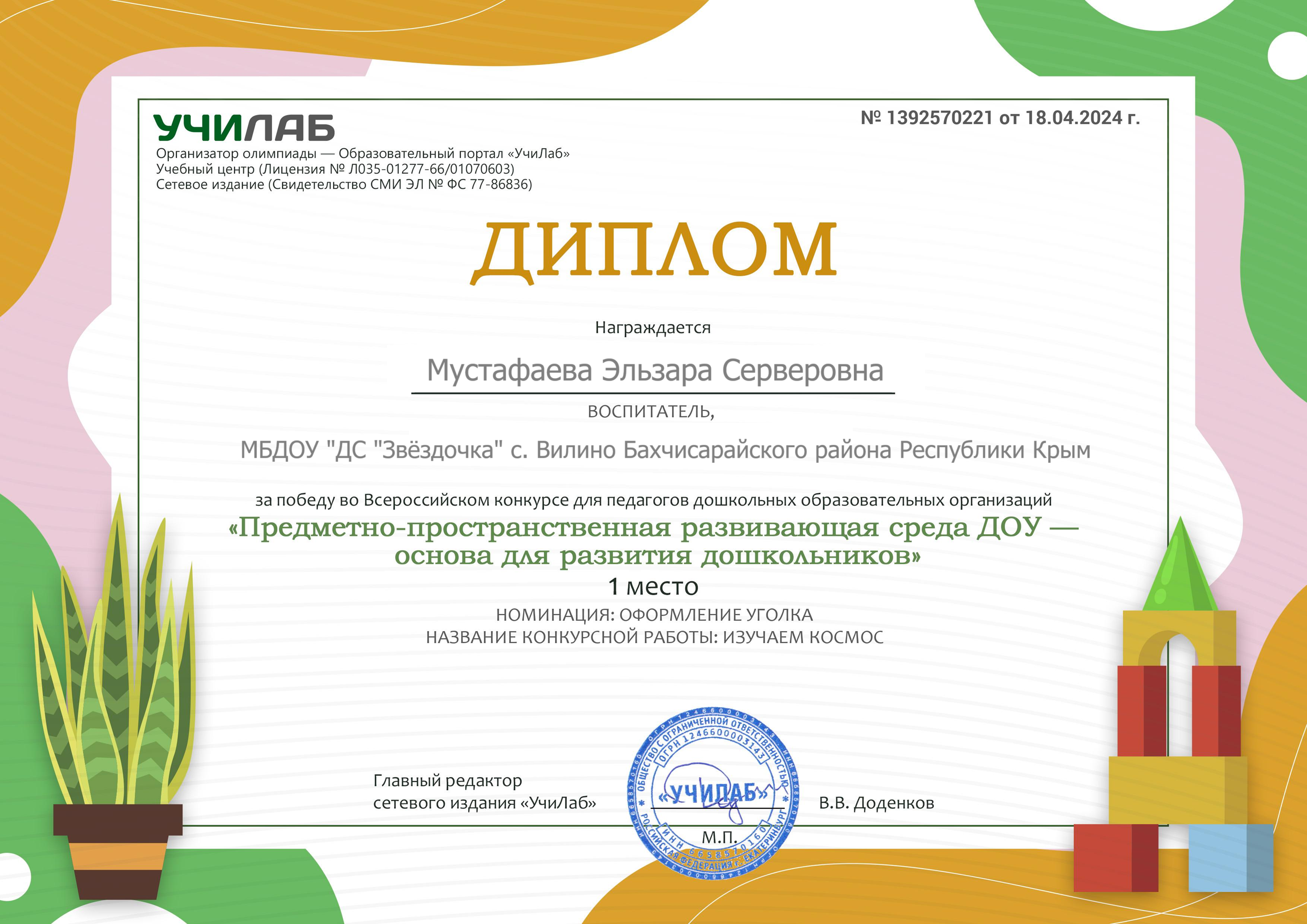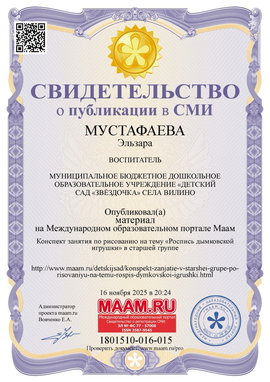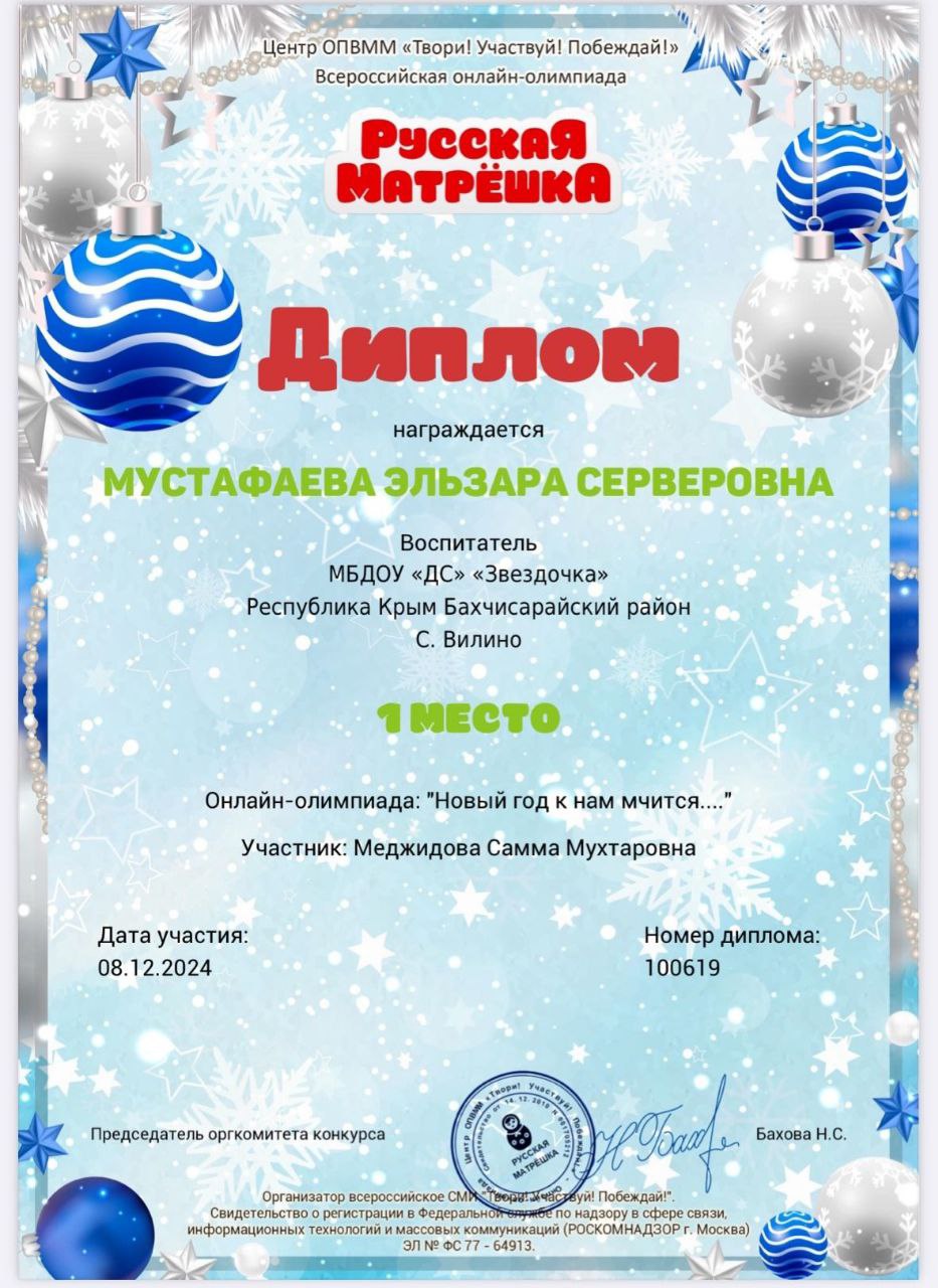Имею высшее образование:в 2013 году окончила Крымский инженерно‑педагогическийуниверситет (КИПУ) по специальности «Учитель начальных классов».В 2021 году прошла профессиональную переподготовку вКрымском Республиканском институте постдипломного педагогическогообразования по направлению «Образование и педагогика.Теория и методика дошкольного образования».На данный момент имею первую квалификационную категорию.Дата ее присвоения 6 июня 2024г.Постоянно совершенствую свои знания и навыки:регулярно прохожу курсы повышения квалификации иучаствую в профессиональных мероприятиях.В своей педагогической практике уделяю особое внимание самообразованию.Сейчас работаю над темой «Макетирование, как средство ознакомлениядошкольников с окружающим миром».Убеждена, что использование макетов в образовательном процессе помогает детям:-наглядно изучать окружающий мир;-развивать пространственное мышление;-активизировать познавательную деятельность;-лучше усваивать новые знания через практическую деятельность. |