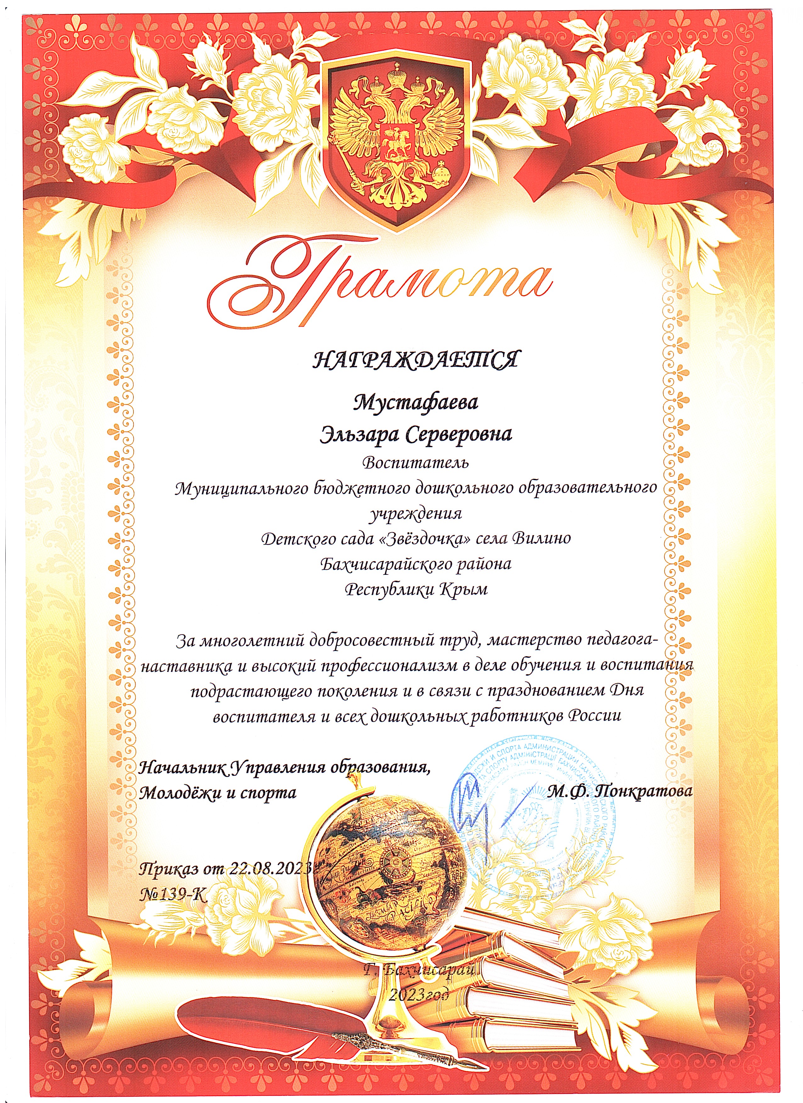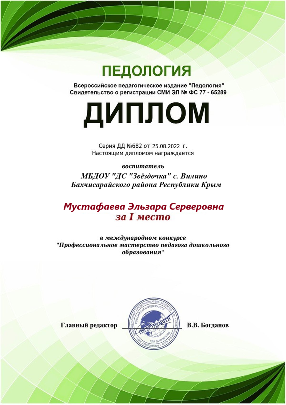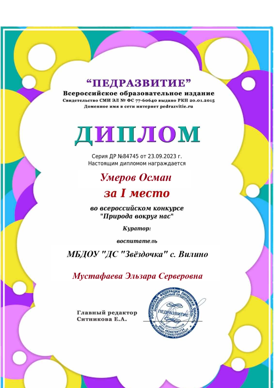 Имею высшее образование:в 2013 году окончила Крымский инженерно‑педагогическийуниверситет (КИПУ) по специальности «Учитель начальных классов».В 2021 году прошла профессиональную переподготовку вКрымском Республиканском институте постдипломного педагогическогообразования по направлению «Образование и педагогика.Теория и методика дошкольного образования».На данный момент имею первую квалификационную категорию.Дата ее присвоения 6 июня 2024г.Постоянно совершенствую свои знания и навыки:регулярно прохожу курсы повышения квалификации иучаствую в профессиональных мероприятиях.В своей педагогической практике уделяю особое внимание самообразованию.Сейчас работаю над темой «Макетирование, как средство ознакомлениядошкольников с окружающим миром».Убеждена, что использование макетов в образовательном процессе помогает детям:-наглядно изучать окружающий мир;-развивать пространственное мышление;-активизировать познавательную деятельность;-лучше усваивать новые знания через практическую деятельность. |
